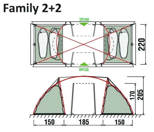 | Размеры внутр. палатки (см) | 2 комнаты, 230 х 150 х 170 |
