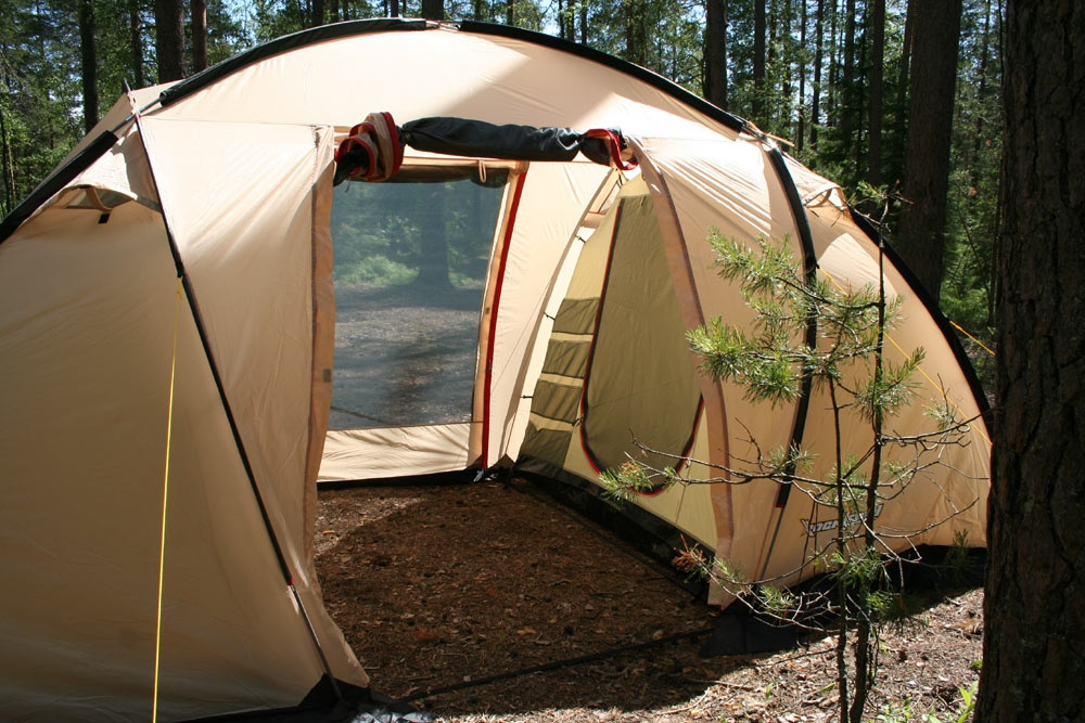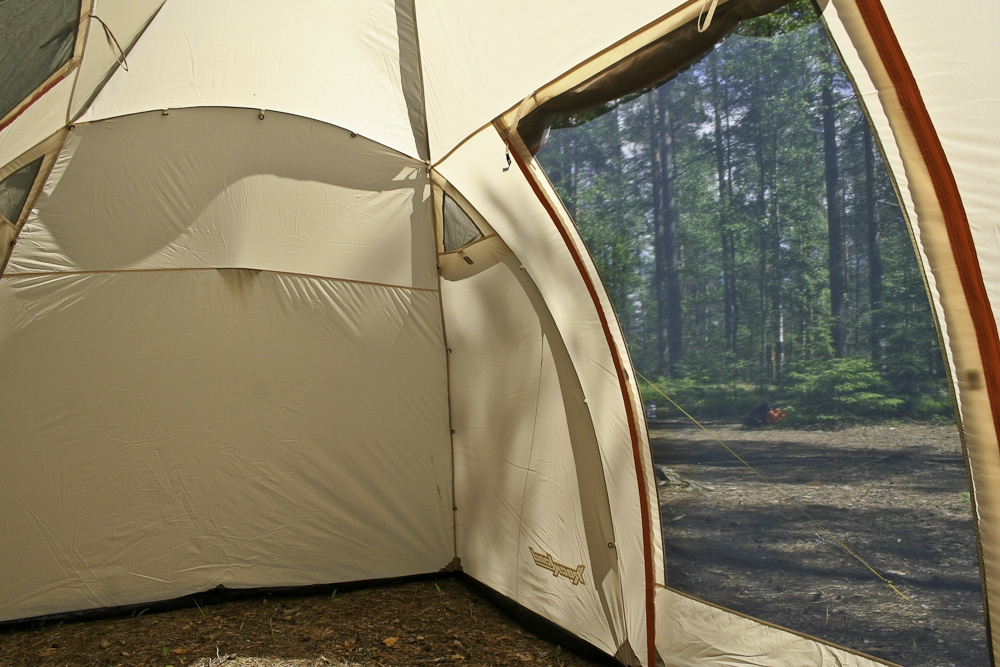 В тамбуре можно установить дно (актуально на сыпучем или мокром грунте, чтобы не вносить грязь во внутреннюю палатку), а перед входом поднять навес на стойках. Возможна установка отдельно тента - палатка превращается в кухню, столовую, кают-компанию. Входы в тамбур можно закрыть как тканью (в дождь), так и только москитной сеткой (обеспечив и хорошую ветиляцию в жаркую погоду, и избежав общества насекомых. А еще можно перед входом поднять козырек на стойках.