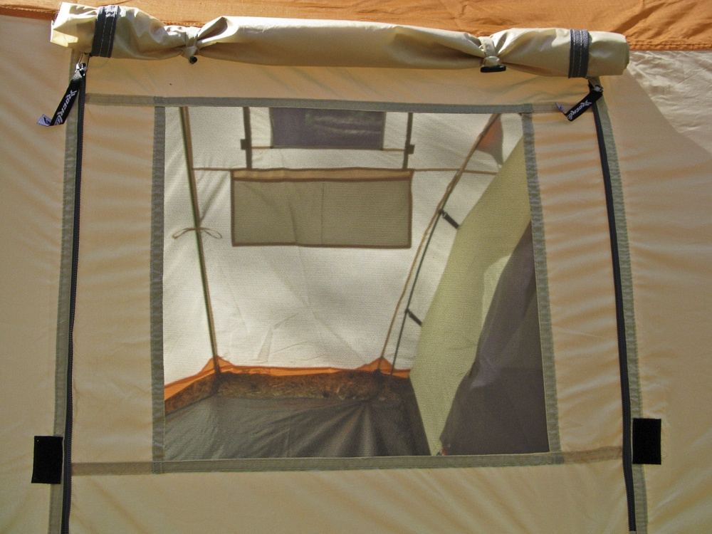 В большом тамбуре есть сетчатые окна, которые могут закрываться. В этом тамбуре можно установить съемный пол (входит в комплект, выполнен из материала Tarpauling). Для вентиляции внутренней палакти на тенте расположены окна с противомоскитной сеткой, которые закрываются шторками на молнии.