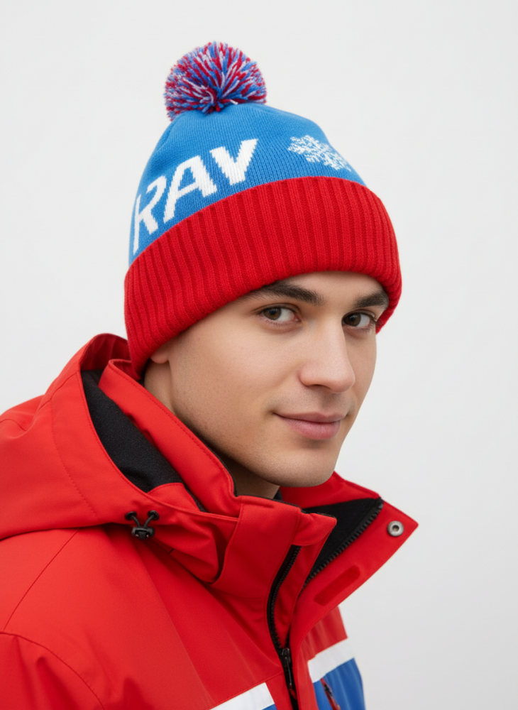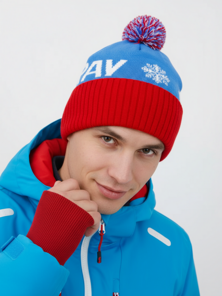 Шапочка RAY вязаная Ray-снежинка бубон, голубой/красный/белый